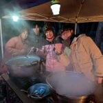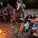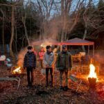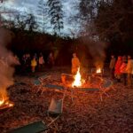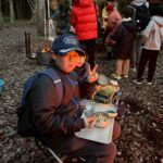 6時20分、野営場到着‼️ 予定より5分遅れでしたが往路を全員で完歩しました😊 テントサイトでは、副団委員長、ローバー隊長、ローバー隊、保護者、大人になって8団を巣立ったOBの先輩も来てくれて、寒さの中、暖かい火をおこし、おいしいお料理を作って待っていてくださいました😌 早速到着を報告して、「いただきます!🍜」焚火の火が暖かい🔥。おいしいうどんで体の芯から温まり、甘いおしるこで体力を回復することができました😊