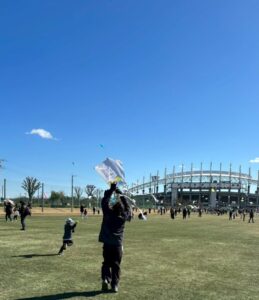 「見て見て!あんなに高くあがったよ‼」と笑顔いっぱいに、風の力を全身で感じながら凧あげを楽しんでいました。