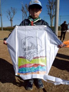 凧に好きな絵柄を描いて完成させた自慢の凧を手に、スカウトたちは元気に会場に集まってきました。