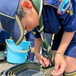 スカウト達も怖がらずにミミズをカットして、釣り針に付けていました。